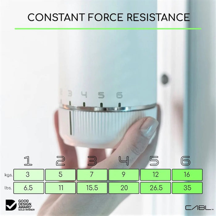 The ADAPT Cable Trainer has a weight range of 3kg to 16kg (6.5 lbs to 35 lbs). However, this is not directly comparable to standard weights. The technology delivers weight as a challenging Constant Force. With the ADAPT Cable Trainer you are actually working much harder each rep than with normal weight machines or free weights, therefore maximising toning, sculpting and strengthening your body.