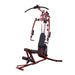 Complete gym in one compact, affordable machine. The padded pressing arms follow the natural arc of a free weight bench press and pectoral dumbbell fly. Features 2200 lb. test nylon coated aircraft quality cables and fiberglass pulleys with ball bearing movement on solid axle rotation. Includes high pulley with wide grip lat bar and low pulley with narrow grip low row bar. No cable change design!
