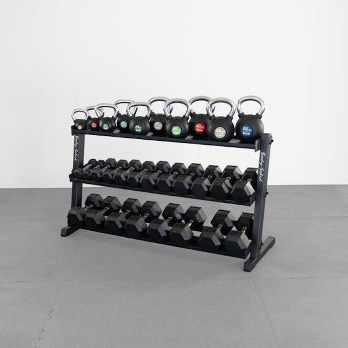 Keep your workout area organized, clean and, most importantly, safe. Our weight trees and dumbbell racks can be placed against any wall or centered in a room. Nobody builds stronger or more space efficient storage units. Heavy gauge steel with all-4-side welded construction is deburred inside and out for user safety. Heavy-duty 2" x 3" mainframe features a reversed pitch design that allows easy access to all three tiers.