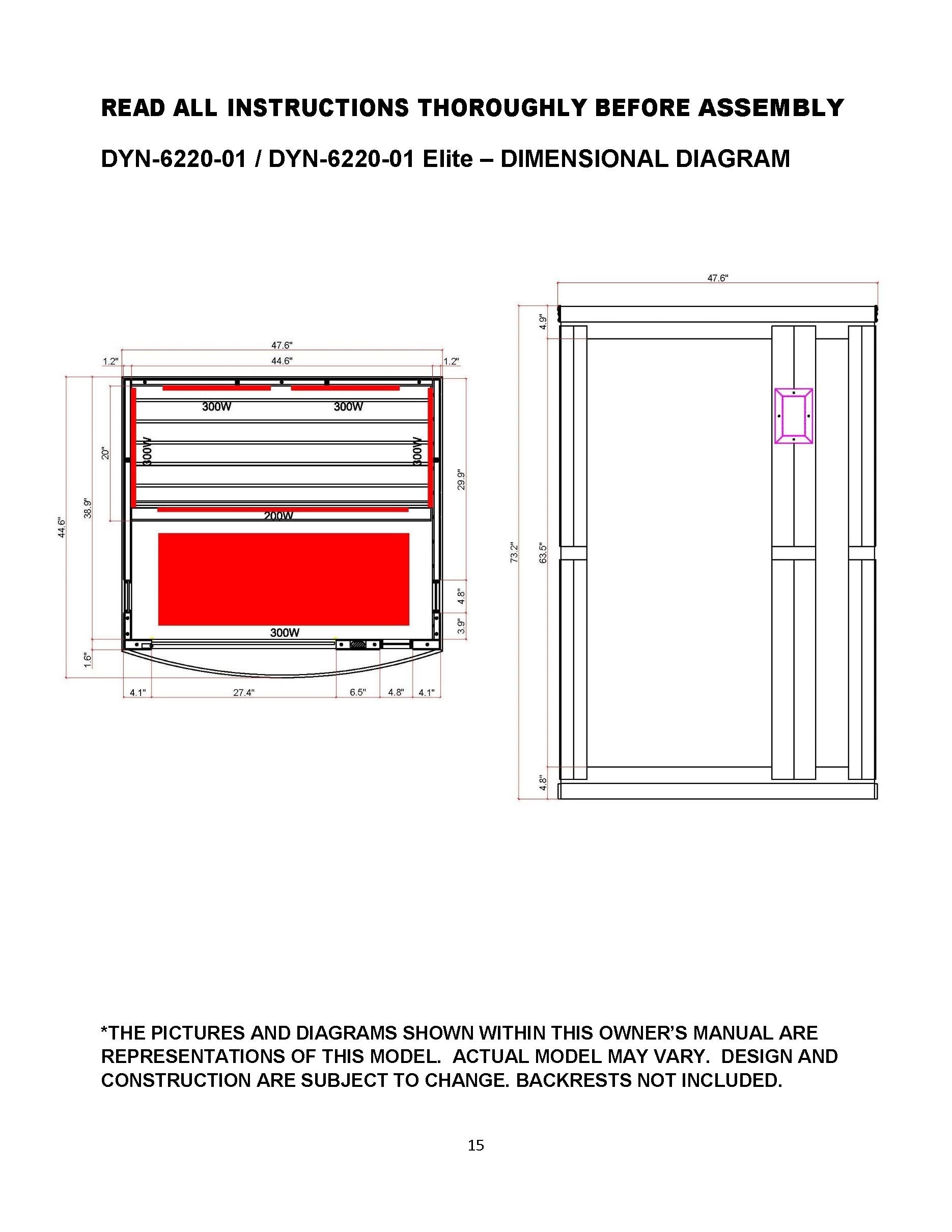 Golden Designs, Inc. under the Dynamic brand name warranties the wood, structure, heating elements, and electronics against defects in material and workmanship for a period of 1 to 5 years from the original date of purchase. This sauna is for INDOOR use only. Placing your sauna outdoors will VOID this warranty. Any damage due to exposure to outdoor elements such as rain, snow, sun, wind or extreme temperatures will not be covered by this warranty. Any damages as a result of modifications made to the sauna or its components will void this warranty.