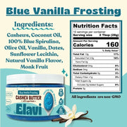 Blue Vanilla Frosting Ingredients: Cashews, hempseed oil, blue spirulina, organic dates, vanilla, monk fruit, natural flavor