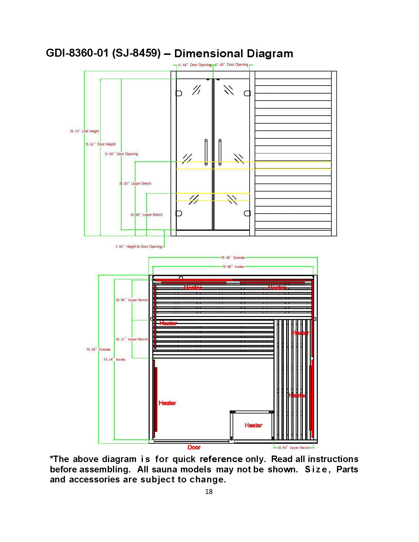 Golden Designs, Inc. under the Dynamic brand name warranties the wood, structure, heating elements, and electronics against defects in material and workmanship for a period of 1 to 5 years from the original date of purchase. This sauna is for INDOOR use only. Placing your sauna outdoors will VOID this warranty. Any damage due to exposure to outdoor elements such as rain, snow, sun, wind or extreme temperatures will not be covered by this warranty. Any damages as a result of modifications made to the sauna or its components will void this warranty.