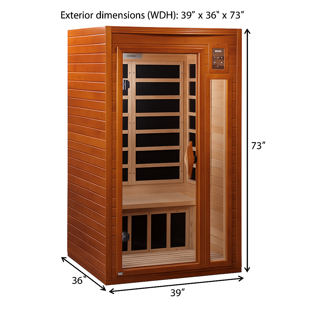 Unlike traditional rock and water saunas (which heat at or over 200F and do not penetrate your skin), Dynamic Saunas operate at a much lower and safer 130F. In fact, Dynamic Saunas operate most effectively at 120F thus allowing you to enjoy the sauna longer and maximize all potential health benefits. Dynamic 1-2 person sauna is designed for ease of use and is an outstanding value. Assembly is a snap and takes less than 1 hour. Enjoy the convenience of operating a Dynamic Sauna with our dual (int. and ext.) soft touch control panel and LED display featuring sauna temperature and time functions. Play your favorite music through the saunas built in MP3 aux connection with speakers. The sauna plugs into any dedicated 15 amp 110 volt outlet so no special wiring is required and the sauna may be installed on carpet and at any indoor location including the basement, garage, master bath or walk in closet. Our sauna would be a beautiful and worthwhile addition to any fitness room. See and feel the difference today!