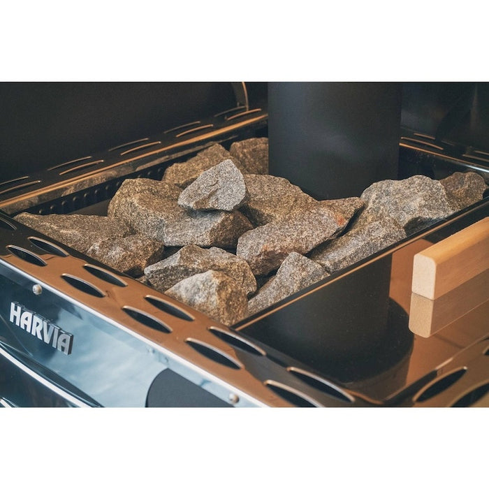 Harvia Pro 20 LS is a popular choice for cottage saunas because of its practicality. On the left side of the heater is a fixed and easy-to-use 30-litre water tank, which heats the water at the same time as the heater heats up. The Harvia Pro model has a graphite black exterior and a stainless-steel front. The heater's impressive glass hatch creates an atmosphere in the sauna and the large stone space ensures excellent sauna experience.
