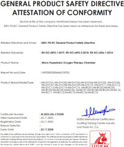 Our hyperbaric oxygen chambers are rigorously tested and fully CE-certified, complying with safety standards (GPSD, EMC, and Low Voltage Directives). Every unit meets strict quality benchmarks for your peace of mind.