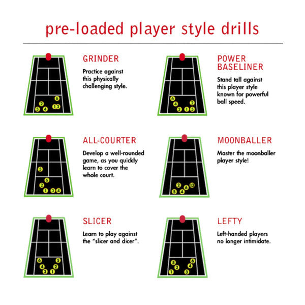 6 pre-loaded, 6-shot drills that simulate the most popular styles of play: grinder, all courter, power baseliner,