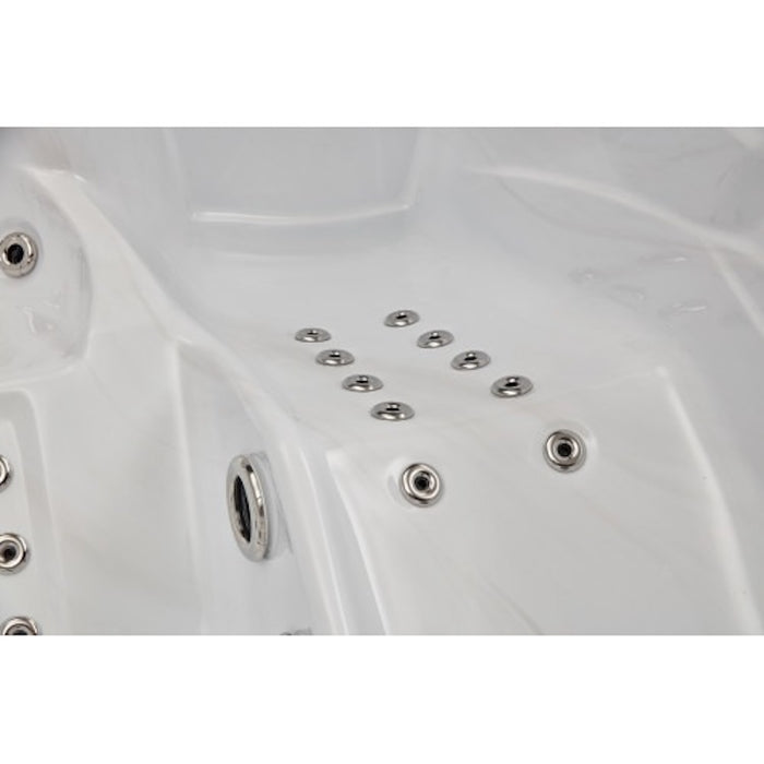 The Casey 3-Person luxury home spa features an ultra-comfortable lounge seat and 47 stainless steel jets packing a complete hydromassage experience into a compact design. The Casey home spa is designed to provide all the features of larger luxury spas in a smaller footprint. It is 32 inches deep, giving plenty of soaking room and the adjustable hydro-massage jets provide an unmatched deep-tissue massage. The multi-color underwater LED lighting system adds a relaxing ambiance, while the powerful multi-speed pumps offer ample power for the massage jets in this rectangular home spa. The filter pump ensures the water continues to circulate periodically while the spa is not in use keeping the water clean and sanitary. A premium integrated Bluetooth sound system is included. Full foam insulation improves energy efficiency and reduces operating costs in colder climates. UV-rated insulated spa cover and premium steps are included (A $495 value!)