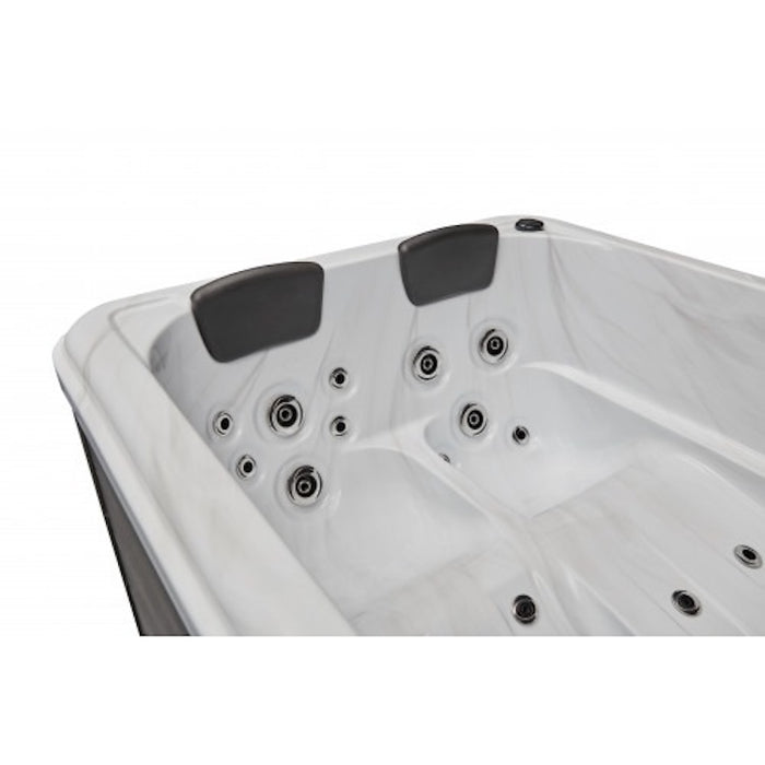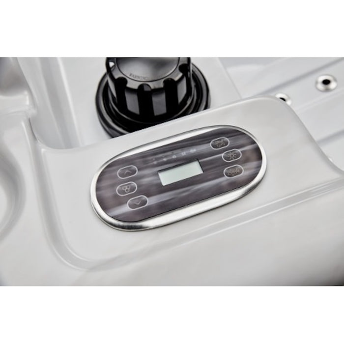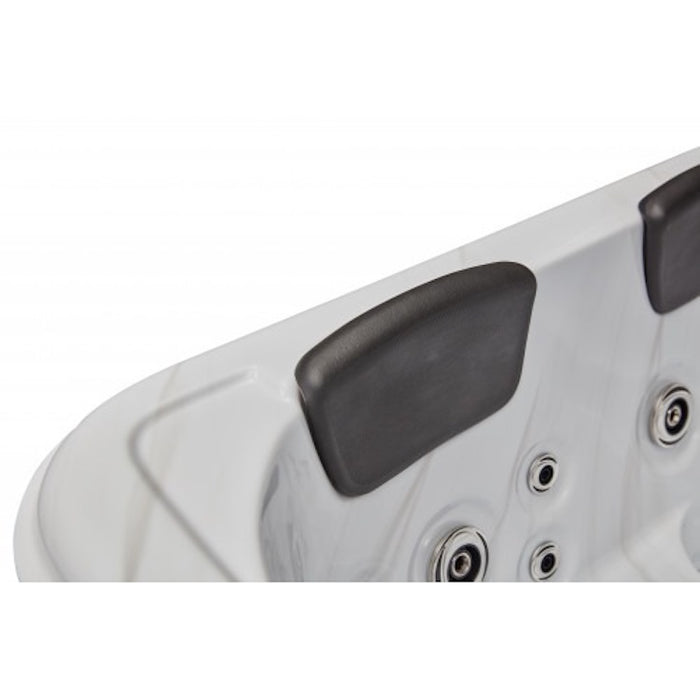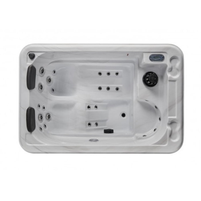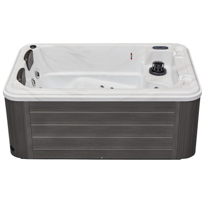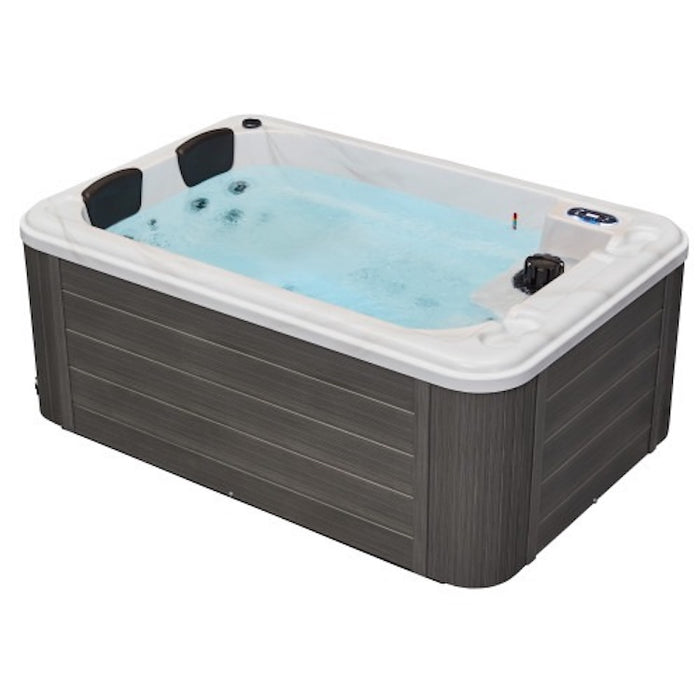 The Riley 3-person home spa with cloud grey interior features two spacious lounge seats and 26 total jets packing a lot of power into a compact design. The Riley is designed to provide all the features of larger luxury spas in a smaller footprint. It is 31 inches deep and 77 inches long providing a deep soak with plenty of room to stretch out and relax. The multi-color underwater LED lighting system will provide a relaxing environment while the strategically positioned back, foot and leg massage jets provide a complete lower body massage. Insulated spa cover and premium steps included. (A $495 value!)
