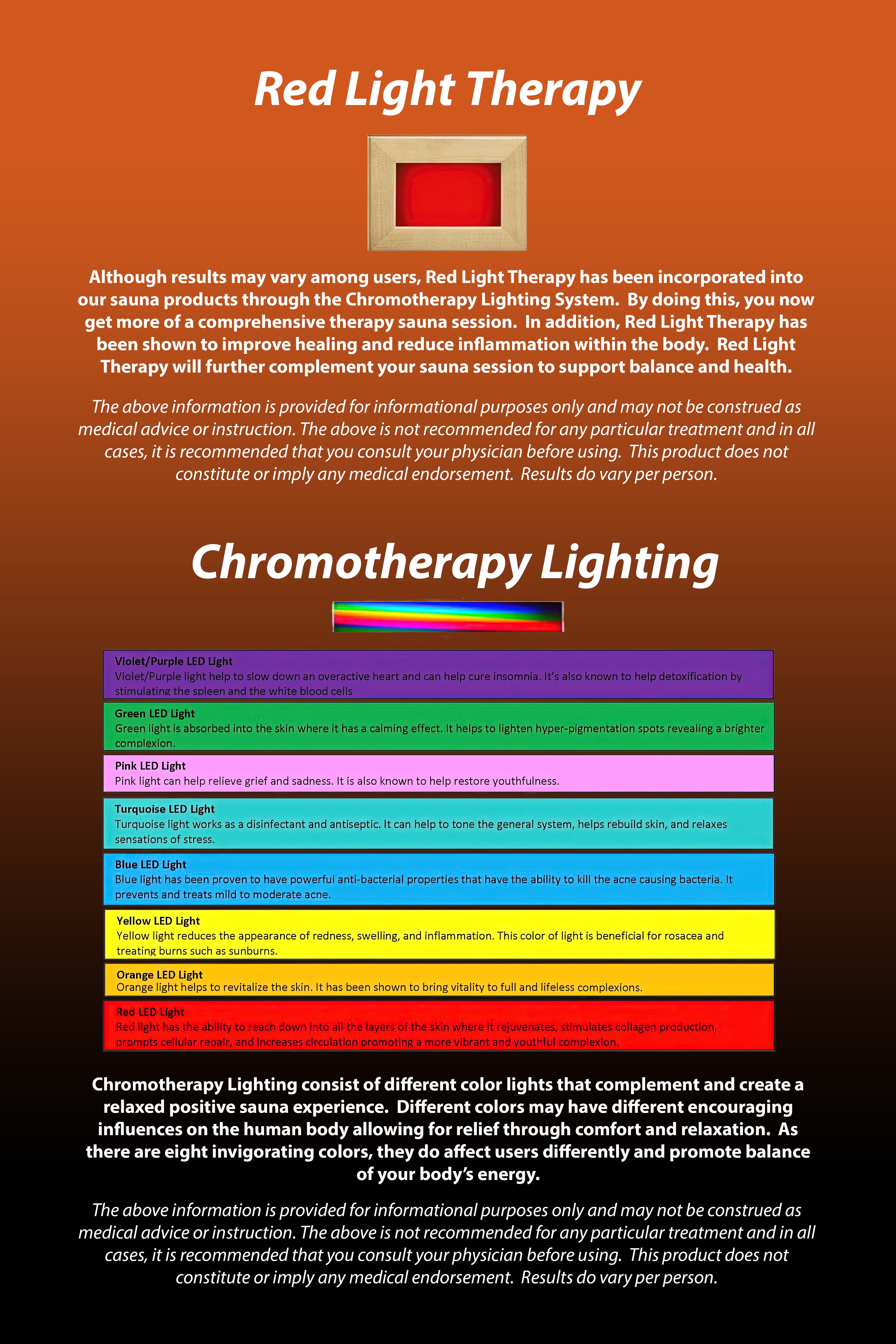 *Limited Lifetime Warranty of Sauna Products is 5 years for residential use and 1 year for commercial use on heating elements and electronics from the date of purchase. The wood structure has a 1 year limited warranty.