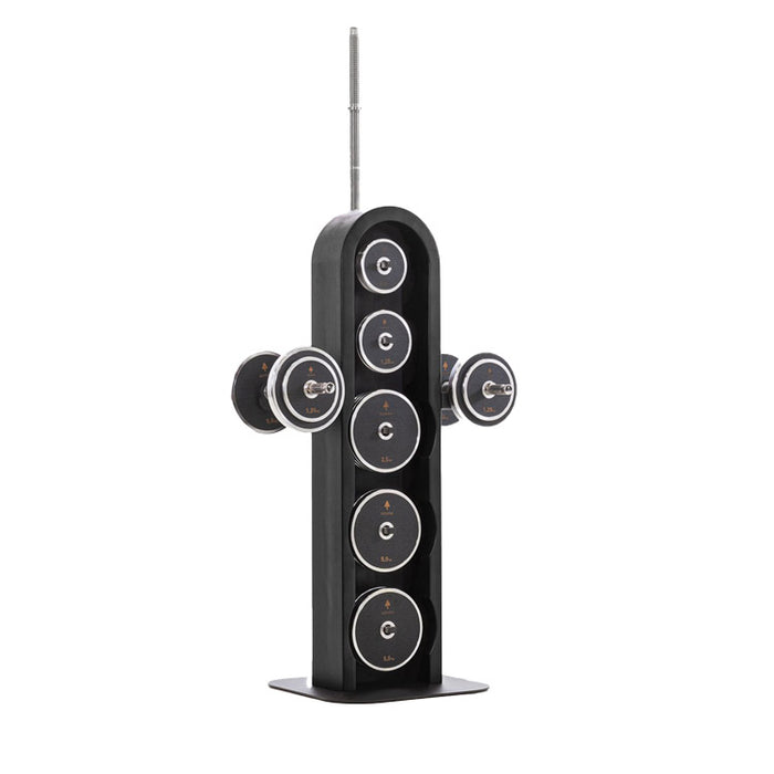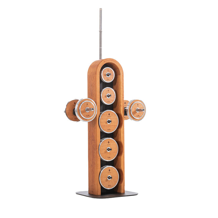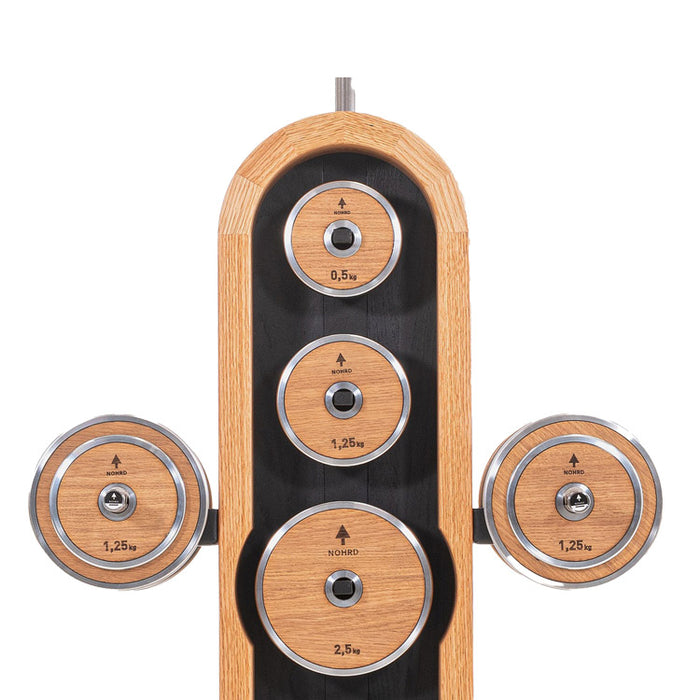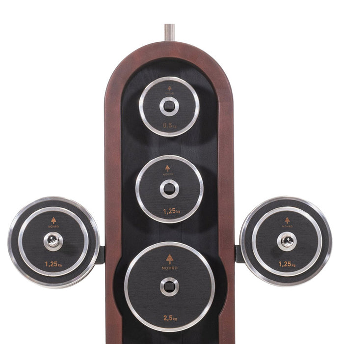 Incredibly robust and crafted of solid wood to meet our highest quality standards, the WeightPlate Tower is the perfect weightlifting storage solution for your bells and weight plates. The 20 piece set is configured by 8 x 5kg, 4 x 2.5kg, 4 x 1.25kg and 4 x 0.5kg weights and entails 2 expertly designed short dumbbells and one long barbell from our partner Gungnir of Norway, featuring their innovative SlideLock™ mechanism for loading and secure placement.