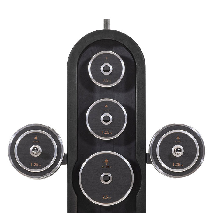 The NOHRD WeightPlate Tower includes two short Dumbler and one 160cm long Pumper barbells by Gungnir of Norway, with their award-winning SlideLock™ mechanism. This cutting-edge feature is designed for swift and secure locking of the weight plates, allowing you to completely focus on your workout. Load up the Dumblers to 32 kg each or stack the Pumper with a total of up to 62 kg.