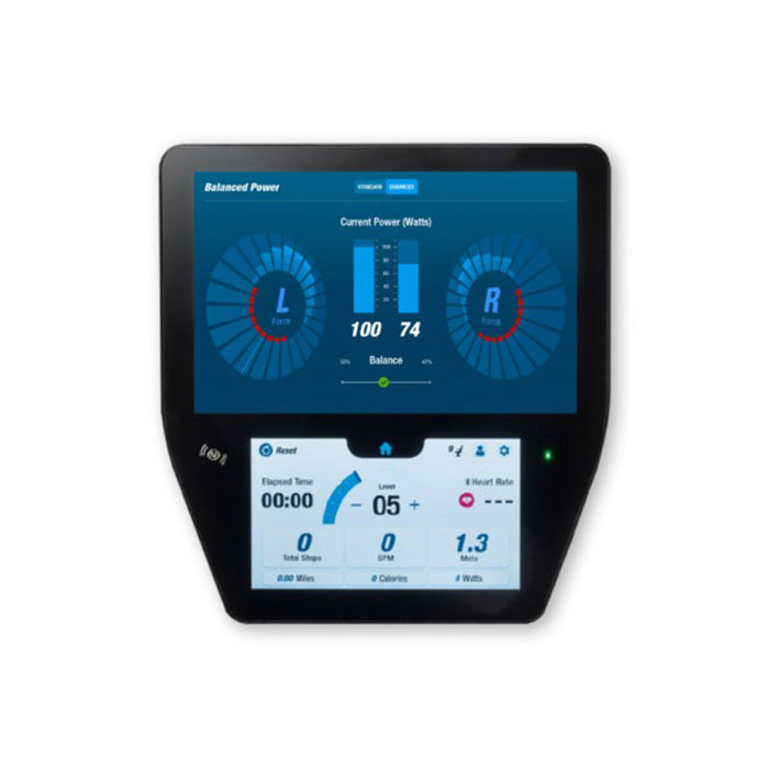 Integrated sensor technology captures and displays power and symmetry data in real time. Dual-touchscreen console with HD display. Intuitive user interface with engaging workout programs and easy-to-track metrics. The ergonomically designed padded seat with contoured back support provides a stable, supportive position for users while exercising