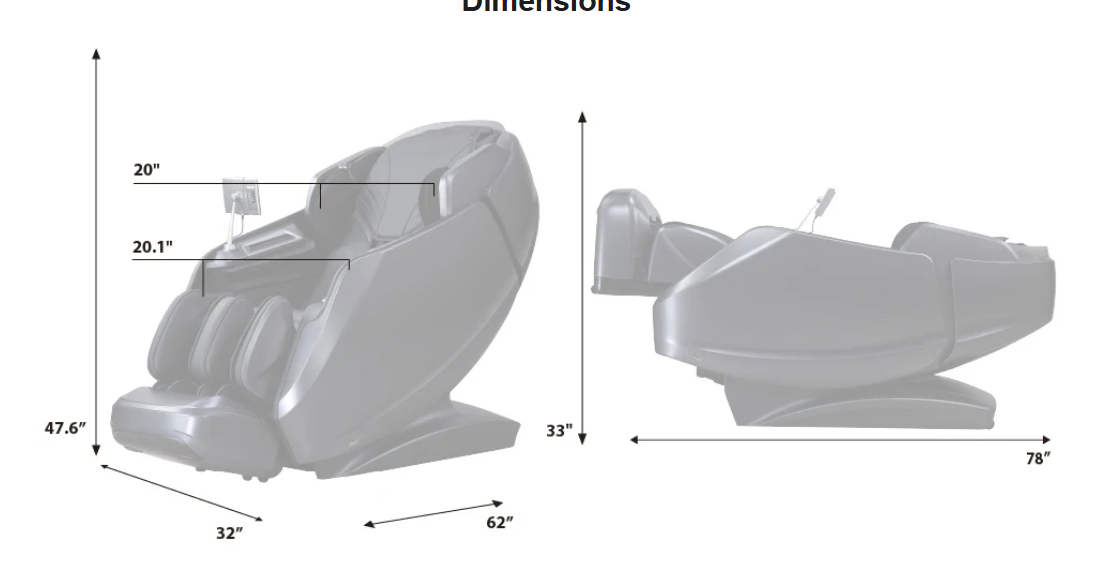 Dimensions (WxLxH) Upright: 32” x 62“ x 47.6” Recline: 32” x 78” x 33”