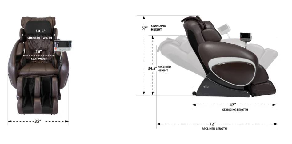 • Zero Gravity Massage - Inspired by NASA technology, the Zero gravity position is the perfect position to enjoy a massage, aligning your back relative to your thigh at an optimal level of comfort. When reclined into the zero gravity position, the complete weight of your back is virtually supported by the backrest which maximizes the intensity of the massage. This feature improves spinal decompression and decreases muscle tension of the spine. There are 2 stages of zero gravity, the 2nd being more reclined. When reclined fully, to where your legs are higher than your heart level, the therapeutic effects are incredibly effective and may be felt immediately.