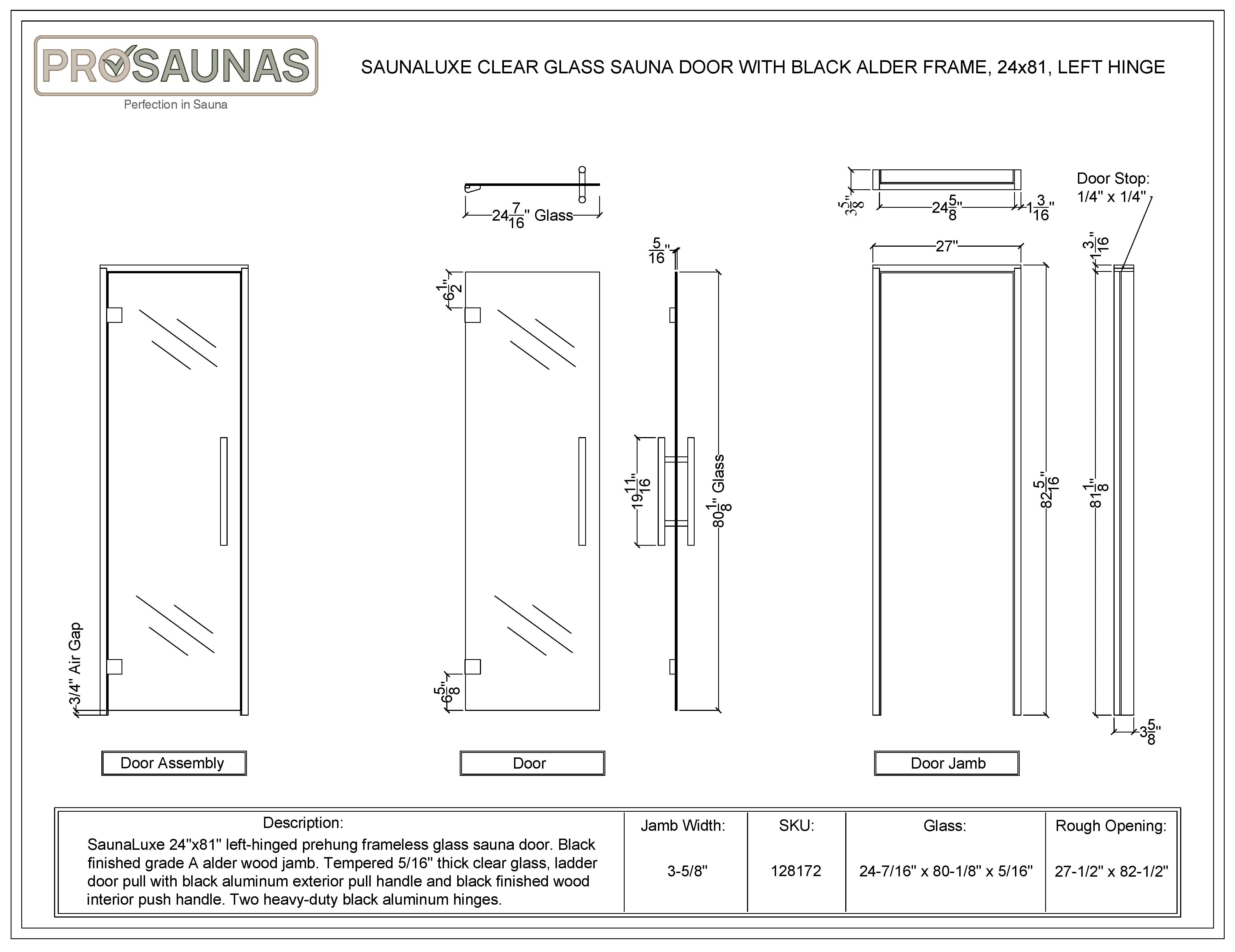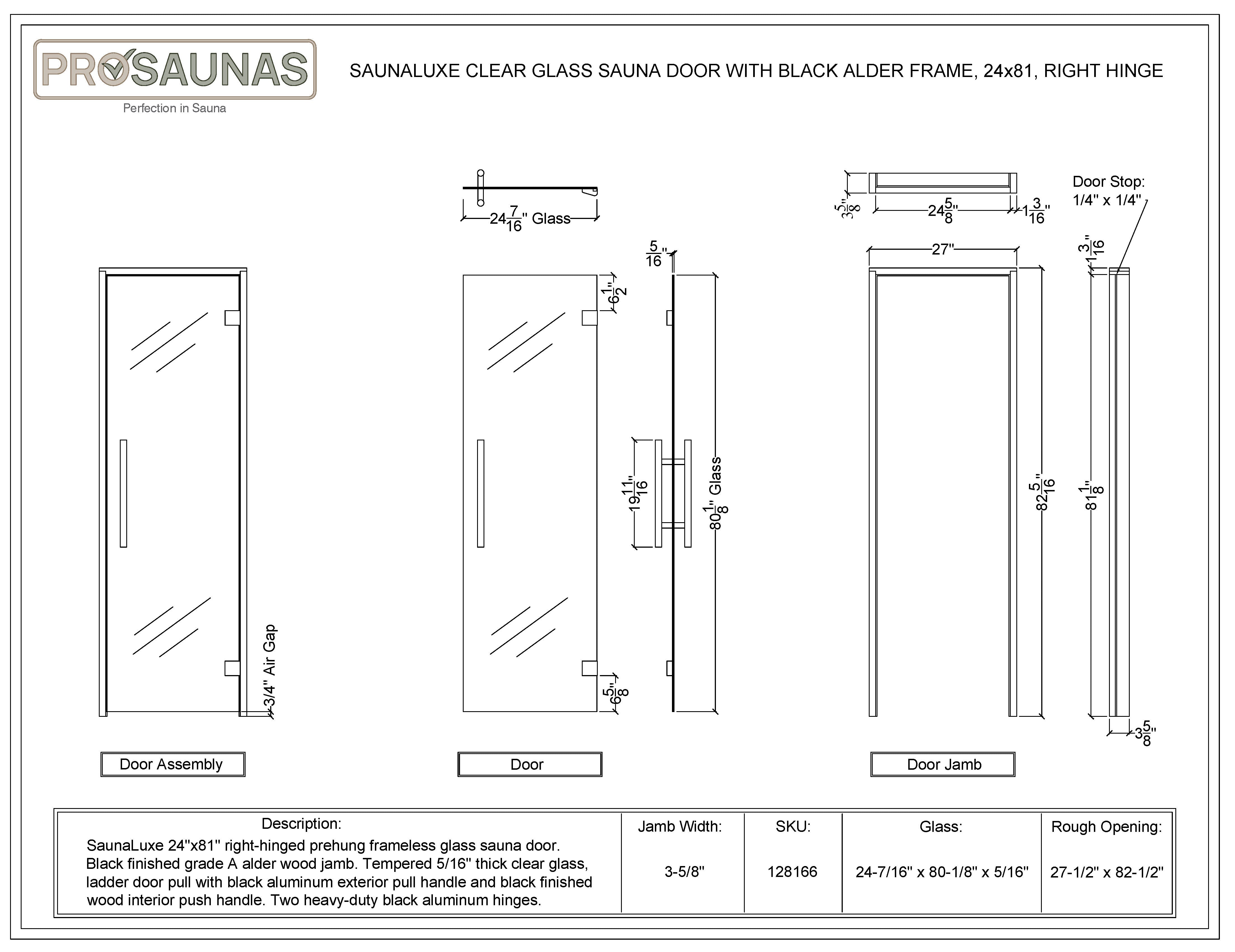 This handcrafted sauna door from PROSAUNAS is an affordable addition to your home or commercial sauna. These precision-built hinged glass sauna doors will add an elevated level of sophistication to your sauna. Each door is pre-hung for ease of installation, featuring elegant frameless 8mm clear tempered glass and premium-quality black coated alder wood jambs and header.