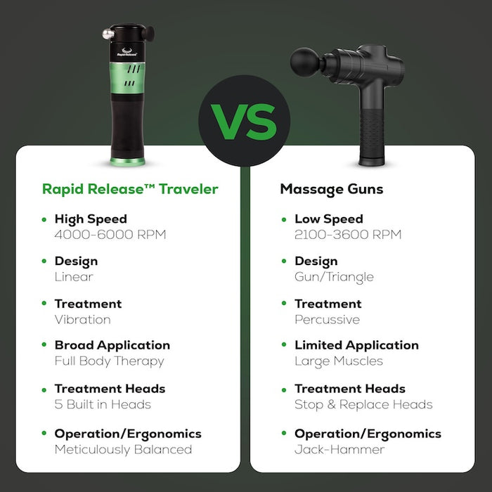 The Rapid Release™ Traveler fits conveniently in your purse, pocket or gym bag, so you can apply vibration therapy whenever and wherever you need relief. A consumer-centric model, the Traveler includes three variable speeds to maximize comfort to areas like the face, neck and hands.. The Traveler features platinum treatment heads and a polished finish to parallel the brand requirements of our high end spa and massage therapy clients.