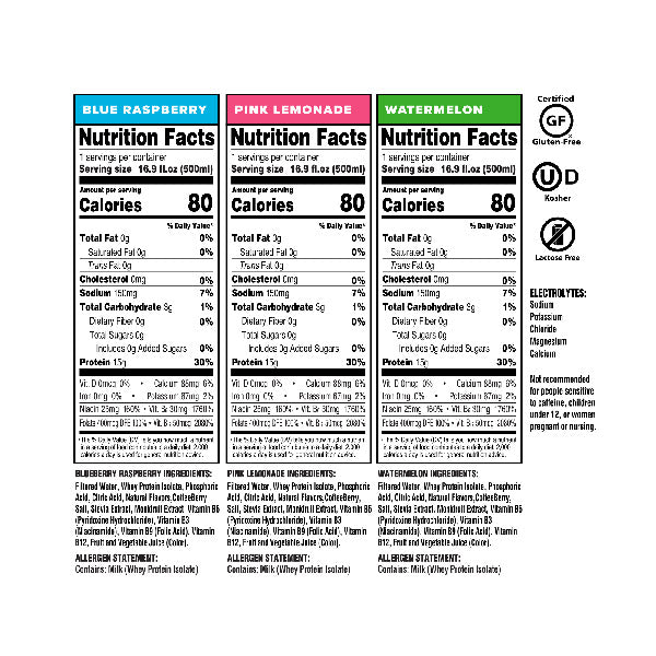 Ready Energy + Focus delivers 125mg of Natural Caffeine, B Vitamin Focus Blend, 15g Whey Protein Isolate and 0g Sugar & 5 key electrolytes. We never use any sugar, sucralose, dyes, or artificial ingredients so you don’t have to worry about getting weighed down or crashing later.