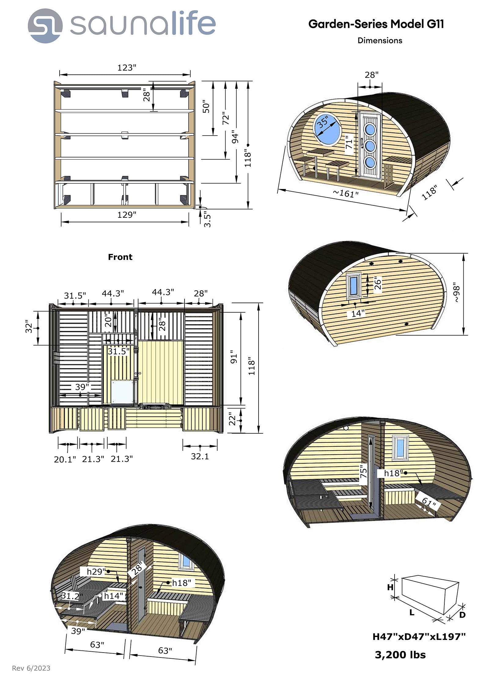 Lavishly designed for sauna splendor, the G11 features two large spaces and can accommodate family and friends. One half of the G11 is a sauna room featuring 2-tier benching for seating up to 8 bathers! The second, equal-sized room is a lounge and dressing room with additional seating and is separated from the sauna by a partition wall with a tempered glass door. Unlike any other backyard sauna kit, the G11’s charming organic design complements its surroundings and blends beautifully with nature.