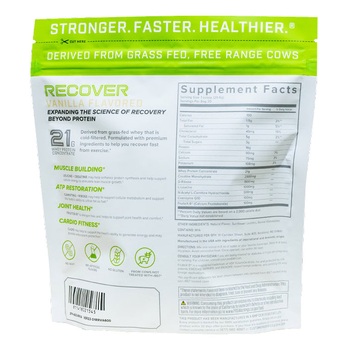 RECOVER is an innovative post-workout supplement designed to help shorten your recovery time and maximize results. RECOVER is formulated with a host of nutrients intended to help you recover and build, from high-quality Whey Protein for recovery, Leucine and Creatine for muscle growth, powerful antioxidant CO-Q10, energy-boosting Ribose and Carnitine, and Fruitex-B® for joint support.