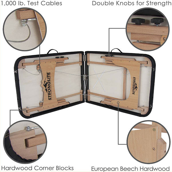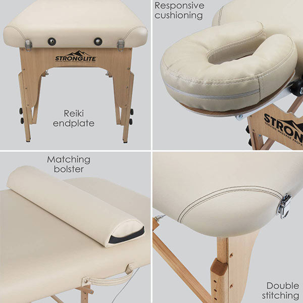 The Stronglite Olympia Portable Massage Table is a strong and durable treatment table for physical therapy. The Olympia is made with high-quality beech hardwood, coated steel cabling support system, and sturdy hardwood corner blocks. This massage table is generously upholstered with 2.5” of small cell foam, and supple soft vinyl with double stitching on its round corners. It comes with ½-reiki ½-standard endplates that provide the perfect balance between easy access and table stability. A fully adjustable face cradle with a soft, matching face pillow gently supports your clients in the proper massage position. The portable massage table package travels and stores easily in the rugged nylon carry case.