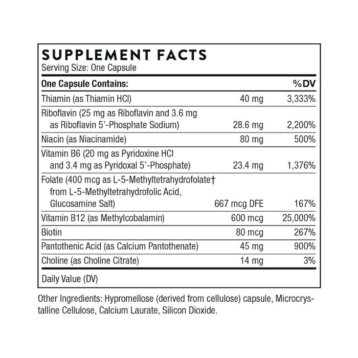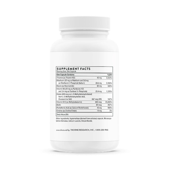B-Complex #12 offers a complete vitamin B complex, with added vitamin B-12 and folate. Supplementing with the active forms of the B vitamins is extremely important to everyone, especially individuals who might not be able to convert non-active B vitamins to their active forms in the liver because of compromised liver function, poorly functioning enzymes, digestive disorders, or increasing age.* Vitamin B12 and folate are necessary for normal red blood cell formation, tissue and cellular repair, normal methylation and homocysteine metabolism, and DNA synthesis.* Thorne's B-Complex #12 supplies the active form of vitamin B12 – methylcobalamin – as well as the active form of folate – 5-MTHF. The other bioactive forms of the B vitamins in each capsule ensures you will get the most bioavailable vitamin B complex available.* B-Complex #12 is not derived from yeast.