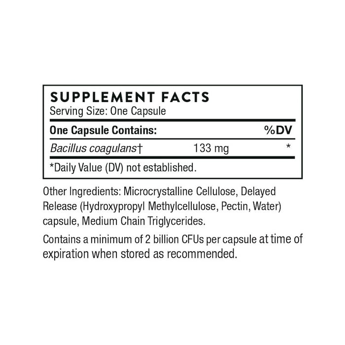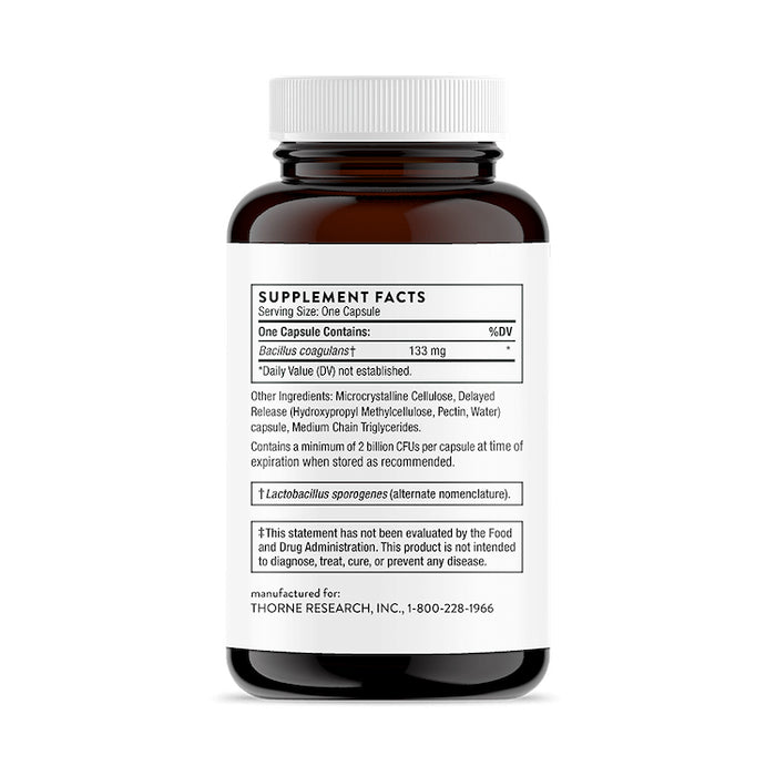 The intestinal tract contains trillions of bacteria that, when a person is healthy, coexist with us in a beneficial, symbiotic relationship. The beneficial bacteria help digest food, produce vitamins, regulate the metabolism, and facilitate a normal immune response.* Probiotic bacteria promote a healthy intestinal environment by producing lactic acid and by secreting fatty acids that are helpful to the growth of other beneficial microorganisms.* Bacillus coagulans (also known as Lactobacillus sporogenes) is a lactic acid-producing bacteria that is unique in probiotic supplementation.* While this beneficial bacteria is dormant in the bottle, it reverts to a growing bacteria in the intestines.* As a result, it resists being killed by stomach acid; in contrast, many Lactobacillus probiotics lose much of their potency before use and do not survive their transit through the stomach.