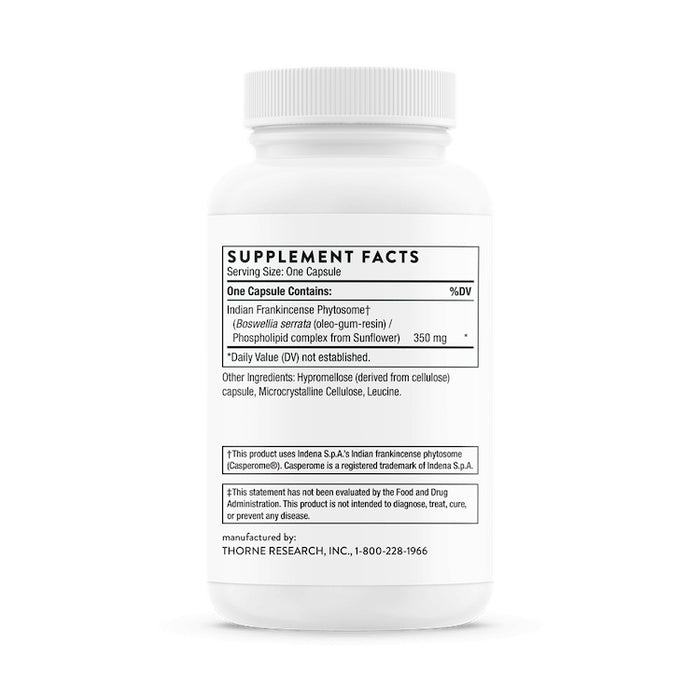 Boswellia phytosome provides superior absorption compared to non-complexed boswellia.* In fact, plasma levels of boswellic acids were 3-7 times higher for the phytosome preparation depending on which boswellic acid was analyzed.* The phytosome preparation also produced tissue levels from 3-35 times higher.* Thorne's Boswellia Phytosome contains a full spectrum of boswellic acids.
