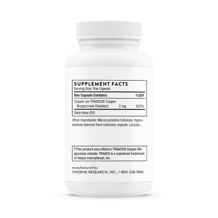 Copper is a trace mineral that is essential for bone health, connective tissue health, cardiovascular health, lipid metabolism, neurological health, and skin health.* It's also a component of the antioxidant enzyme superoxide dismutase. Because copper and zinc compete with each other for absorption, an individual taking a high amount of zinc (for example, 50 mg daily for an extended time period) can develop a copper deficiency. A copper deficiency can render many cell types, including fat cells and blood cells, more susceptible to oxidation.* For this reason, zinc supplementation should be accompanied by copper supplementation.* In a clinical setting, copper supplementation protected red blood cells from oxidation.* Thorne's Copper Bisglycinate provides an optimally absorbed form of copper.