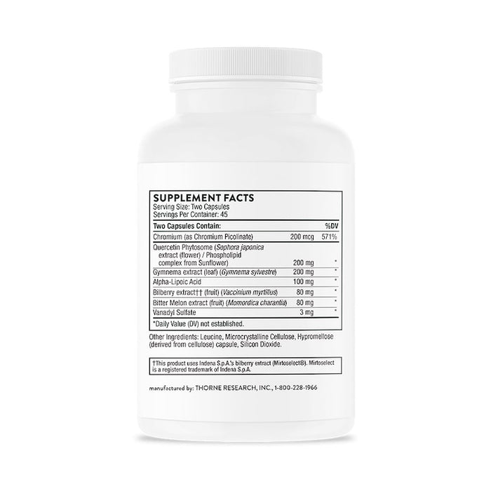 Diabenil contains a comprehensive blend of botanicals and nutrients to support healthy blood sugar levels and help protect nerves, blood vessels, eyes, and kidneys.* Gymnema sylvestre supports already normal blood sugar levels.* Momordica charantia (bitter melon) appears to enhance glucose utilization and depress glucose synthesis in the liver.* Vaccinium myrtillus (bilberry) contains flavonoids that appear to support ocular tissue.* These flavonoids and quercetin strengthen blood vessels and help maintain healthy connective tissues.* Quercetin – in a Thorne-exclusive phytosome for optimal absorption – also inhibits the conversion of glucose to sorbitol, which can otherwise accumulate in the lens of the eye and in the kidneys and nerves.* Lipoic acid can significantly reduce lipid peroxidation of nerve tissue.* Chromium picolinate and vanadyl sulfate are included to help maintain already normal hemoglobin A1C levels.