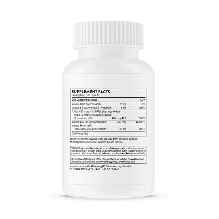 Iron is difficult for the body to absorb, and supplementing with conventional forms of iron, including ferrous sulfate, can cause gastrointestinal side effects – such as nausea, vomiting, constipation, diarrhea, and dark-colored stools. Thorne's Ferrasorb contains iron reacted with glycine to enhance its absorption in the gastrointestinal tract, thus helping to decrease the typical side effects of iron supplementation