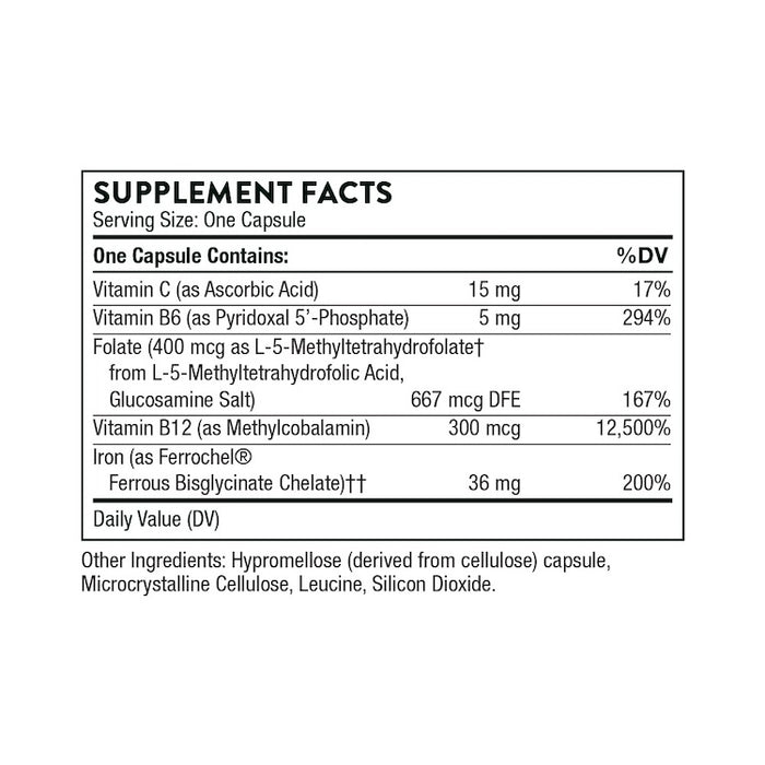 Ferrasorb combines the active forms of vitamin B6 (pyridoxal 5'-phosphate), vitamin B12 (methylcobalamin), and folate (L-5-methyltetrahydrofolate), along with vitamin C, with a well-absorbed form of iron – offering comprehensive nutritional support for anemia.