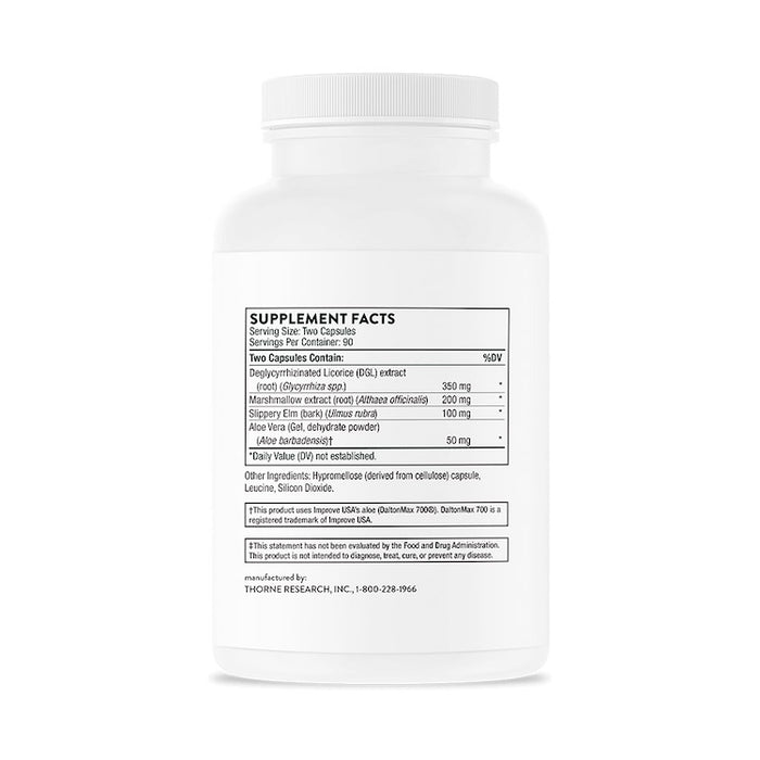 Overindulgence of food and drink – especially spicy foods – can lead to the discomfort of GI irritation. Thorne’s GI Relief comes to the rescue with a blend of soothing botanicals to help relieve gastrointestinal discomfort.* Aloe vera gel, deglycyrrhizinated licorice (DGL), slippery elm bark, and marshmallow root help calm irritated tissues and support the mucous membranes of the GI tract.*