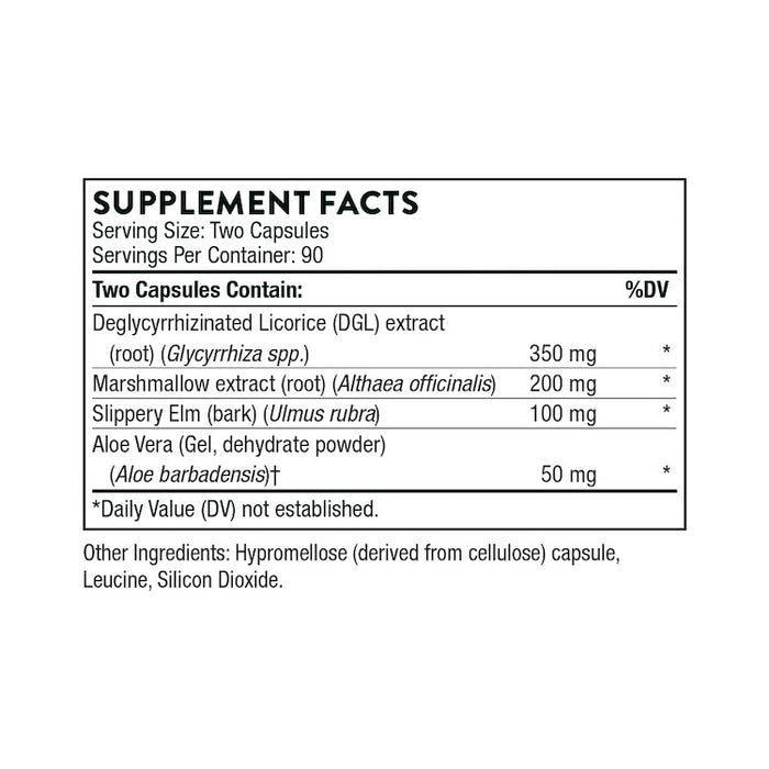 A comforting blend of botanical extracts – aloe vera, slippery elm, marshmallow root, and licorice – to calm irritation and soothe the mucous membranes of the GI tract*