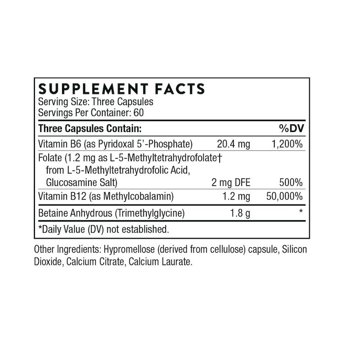 Effective methylation must occur to maintain a normal level of homocysteine.* A deficiency in the cofactors that metabolize homocysteine is commonly seen in the elderly, thus resulting in increased homocysteine levels in the aging population. An elevated homocysteine level associated with aging, as well as less than optimal levels of folic acid and vitamins B6 and B12, often result in the inefficient methylation of numerous substances, such as DNA and proteins, which in turn decreases the integrity of vascular structures and neurons.* Providing the nutritional cofactors for the efficient metabolism of homocysteine also provides support for a healthy brain.