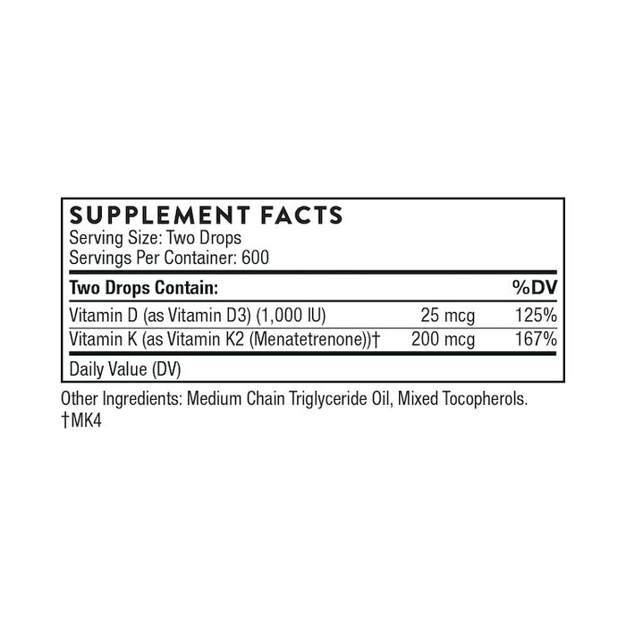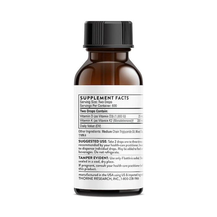 Thorne’s Vitamin D + K2 Liquid promotes bone health, healthy immune function, and cardiovascular health.* The combination of vitamin D3 and K2 provides greater benefits together than either does individually.