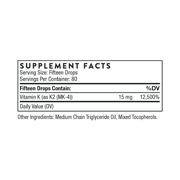 Vitamin K2 offers significant benefit for supporting bone health – more than vitamin K1.* Although vitamin K2 offers well-recognized postmenopausal bone support, because it has no estrogenic effects it also provides nutritional (not therapeutic) support to other populations as well, including anorexics, dialysis patients, individuals with Parkinson's disease, those who have cirrhosis of the liver, individuals who have had a bone marrow transplant, those immobilized after a stroke, and individuals on chronic steroid therapy.* Vitamin K2 also supports a healthy heart and blood vessels.* Thorne's vitamin K2 supplies 1 mg of vitamin K2 per drop. Research shows that 15 mg three times daily can be safely used.* The concentrated liquid and the bottle's metered dispenser make use easy and convenient.