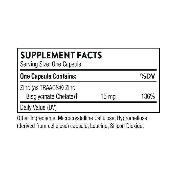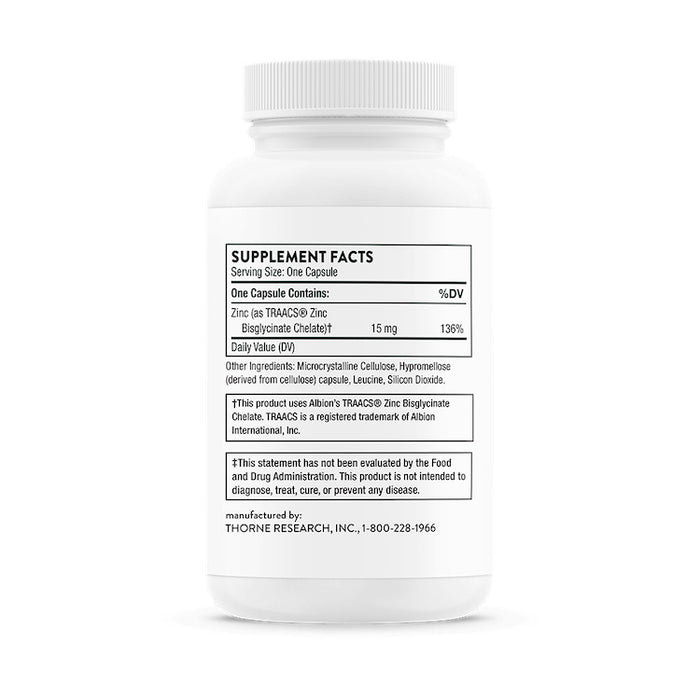 If the body has trouble absorbing a nutrient, then it can't obtain the nutrient’s benefits. Thorne offers two highly absorbable forms of zinc: Zinc Picolinate and Zinc Bisglycinate. Zinc Picolinate is zinc that is bound to the organic acid picolinic acid, which is naturally made in the body from the amino acid L-Tryptophan. Zinc Bisglycinate is zinc that is bound to two molecules of the amino acid glycine – creating a true amino acid chelate.