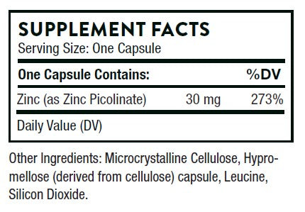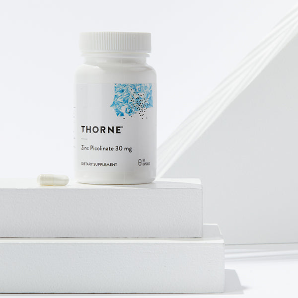 If the body has trouble absorbing a nutrient, then it can't obtain the nutrient’s benefits. Thorne offers two highly absorbable forms of zinc: Zinc Picolinate and Zinc Bisglycinate. Zinc Picolinate is zinc that is bound to the organic acid picolinic acid, which is naturally made in the body from the amino acid L-Tryptophan. Zinc Bisglycinate is zinc that is bound to two molecules of the amino acid glycine – creating a true amino acid chelate.