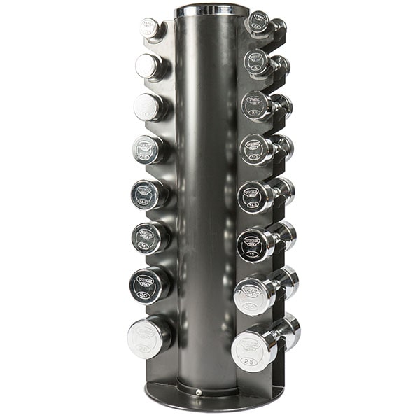 The York Chrome Dumbbell Club Pack offers a highly reflective and attractive dumbbell set that make a BIG visual impact in any setting. The knurled chrome handles are ergonomically contoured to fit comfortably in the palm of the user. Solid steel heads ensure maximum durability of the bright chrome finish, making these dumbbells ultra-resistant to chipping, crackling or peeling. The 2-Sided Vertical Dumbbell Rack included in this pack is a space saving storage rack for the Chrome Dumbbells. The dumbbell handles rests easily on two plastic guards in order to preserve the handles of your dumbbells. A chrome cap is featured on the top of the rack with the YORK® name embossed to add character and style to this rack.